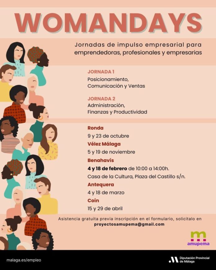 La Diputación de Málaga y la Asociación de Mujeres Profesionales y Empresarias de Málaga (AMUPEMA) celebrarán en Benahavís la tercera edición de Womandays, jornadas de formación y networking dirigidas a mujeres empresarias y emprendedoras. Las sesiones tendrán lugar los días 4 y 18 de febrero en la Casa de la Cultura del municipio, en horario de 10.00 a 14.00 horas. La inscripción es gratuita y las plazas se asignan por orden de solicitud.