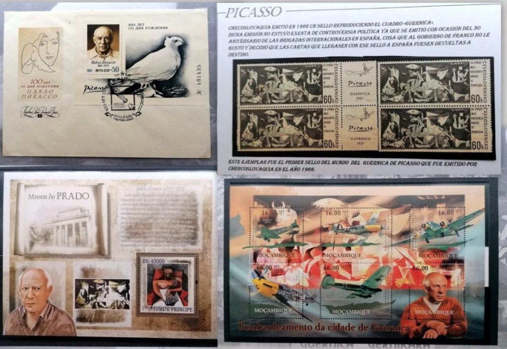 La muestra incluye el primer sello del mundo dedicado a Picasso, lanzado por Checoslovaquia en 1966 con la reproducción del Guernica, así como emisiones conmemorativas del centenario de su nacimiento en 1981 de países como Bulgaria, México o la extinta Unión Soviética. También se exhiben piezas singulares como la hoja bloque coreana con la portada de Minotauro, el pliego francés Paulo vestido de arlequín, un estudio de variantes del sello Mujer leyendo (Francia, 1982) y obras que recuerdan el nombramiento de Picasso como director del Museo del Prado. La selección se completa con emisiones de Mozambique y de la República Centroafricana sobre fondo de oro.
