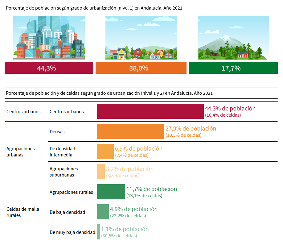 El Instituto de Estadística y Cartografía de Andalucía (IECA) publica la Clasificación del Grado de Urbanización del territorio andaluz a 1 de enero del año 2021. Esta clasificación trata de caracterizar la intensidad del asentamiento de la población en la Andalucía habitada. A partir de la densidad de población, se definen distintas categorías de áreas basándose en criterios de contigüidad geográfica, densidad y umbrales de población, medidas en malla estadística de celdas o cuadrículas de 250 m x 250 m, siguiendo los estándares europeos para la armonización de mallas estadísticas e integrada en la malla estadística de 1 km x 1 km establecida por Eurostat1. A partir de la malla europea se definen tres niveles primarios de densidad: centros urbanos, agrupaciones urbanas y celdas de malla rurales.
