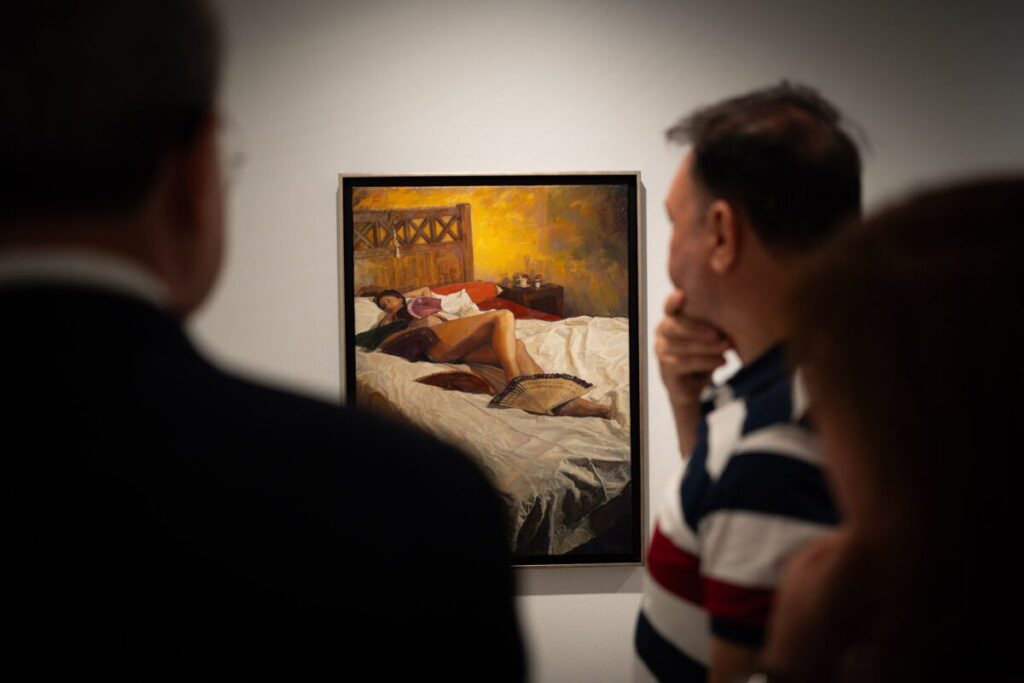 La exposición se distribuye en dos salas: la primera dedicada a la ciudad de Málaga con costumbres, personajes, calles y monumentos malagueños; la segunda reúne retratos con protagonismo femenino.