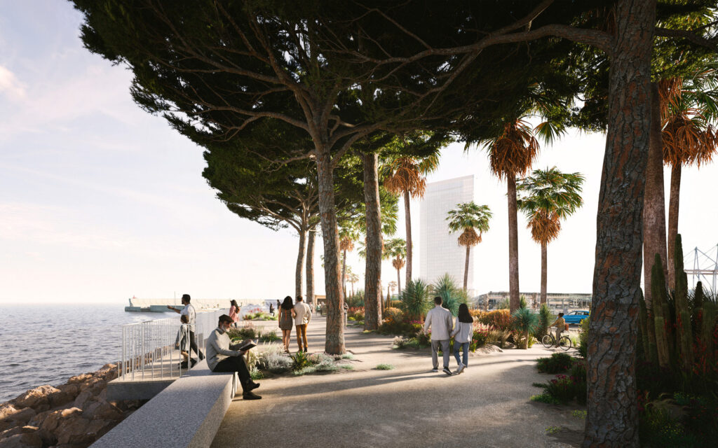 El proyecto arquitectónico plantea la recuperación de un espacio público para la ciudad desde una perspectiva de sostenibilidad urbana, social y medioambiental, diseñando una red de recorridos peatonales y zonas verdes que conectarán el Dique de Levante con el resto de la ciudad.