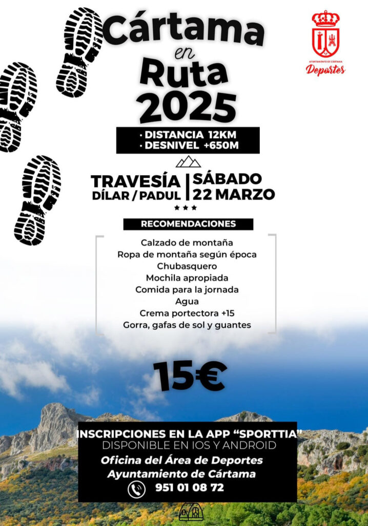 El Ayuntamiento de Cártama, a través de su área de Deportes, ha incluido en su programa «Cártama en Ruta» una nueva actividad senderista que recorrerá los municipios granadinos de Dílar y Padul, programada para el próximo 22 de marzo.