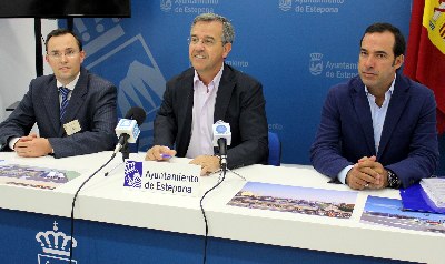 El alcalde de Estepona, José María García Urbano, y el responsable de Expansión de Aldi Supermercados, Eddie Sewerin, han presentado hoy el nuevo complejo comercial que abrirá la cadena en una parcela de 7.600 metros cuadrados en la zona de Isdabe.