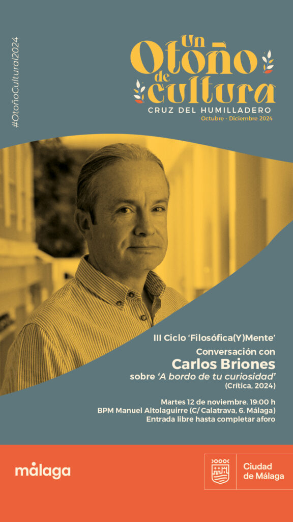El III ciclo ‘Filosófica(y)mente’ del programa municipal ‘Un Otoño de Cultura’, organizado por la Junta Municipal del distrito Cruz del Humilladero, comienza mañana 12 de noviembre, a las 19:00 horas, con un encuentro con el biólogo y escritor Carlos Briones que conversará con el público asistente sobre su último ensayo ‘A bordo de tu curiosidad’ (Crítica, 2024). La biblioteca municipal Manuel Altolaguirre acoge la sesión inaugural de este ciclo de divulgación filosófica y científica que propone un espacio de reflexión de proximidad para todo tipo de públicos. La entrada es gratuita hasta completar aforo.