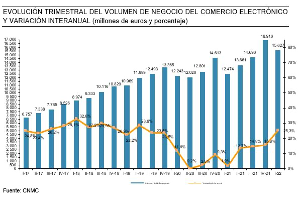 La facturación del comercio electrónico en España ha aumentado en el primer trimestre de 2022 un 25,3% interanual hasta alcanzar los 15.627 millones de euros, según los últimos datos de comercio electrónico disponibles en el portal CNMCData.