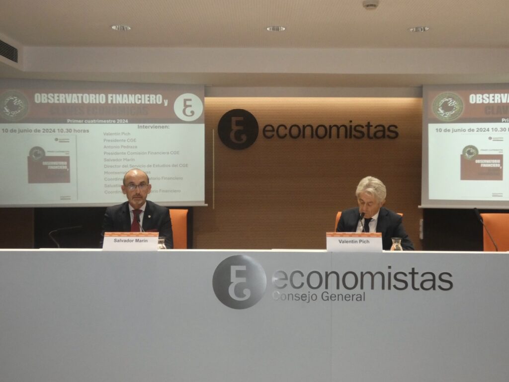 El presidente del Consejo General de Economistas de España (CGE), Valentín Pich, ha presentado hoy el informe del Observatorio Financiero y Claves económicas correspondiente al primer cuatrimestre de 2024, elaborado por la Comisión Financiera y el Servicio de Estudios de dicho Consejo General. En la presentación han participado también el presidente de la Comisión Financiera del CGE, Antonio Pedraza, los coordinadores del Observatorio Financiero, Montserrat Casanovas y Salustiano Velo, y el director del Servicio de Estudios del CGE, Salvador Marín.