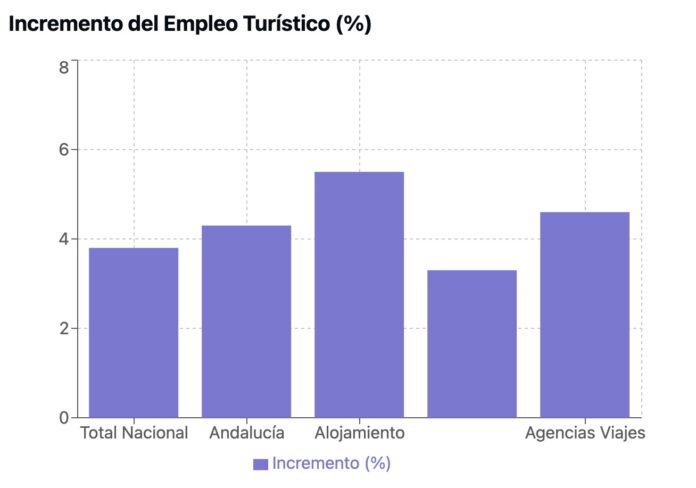 Los trabajadores asalariados, que constituyen el 81,4% del empleo turístico, aumentaron un 4,4%. El mayor incremento se registró en agencias de viajes (4,6%), seguido por servicios de alojamiento (5,5%) y servicios de comidas y bebidas (3,3%). Por su parte, los autónomos, que representan el 18,6% del sector, crecieron un 1,1%.