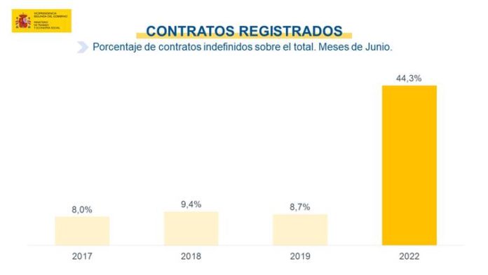 La contratación sigue la tónica de los meses precedentes. Se han registrado 783.595 contratos de trabajo de carácter indefinido que suponen prácticamente uno de cada dos nuevos contratos (44,3%) en un mes marcado hasta ahora por la contratación temporal. Multiplica por cinco la media de contratación indefinida en este mes.