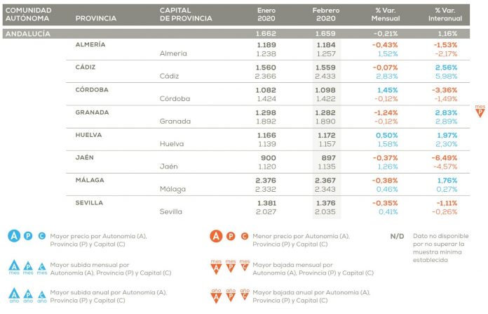 Andalucía fue la sexta autonomía más cara de España, por detrás de Baleares 3.148 €/m²), entre otras. En cuanto a la vivienda de segunda mano en España, en febrero de 2020 registró un precio medio de 1.705 euros por metro cuadrado, arrojando un descenso mensual del -0,01%. De un año a otro, la cifra registrada marcó una subida del 0,22%.