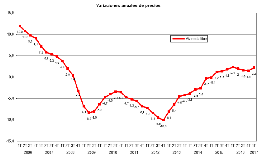 El precio medio del m2 de la vivienda libre se situó en 1.525,8 euros en el primer trimestre de 2017, lo que supone una variación trimestral del 0,9% e interanual del 2,2%. Tras 26 trimestres de caídas interanuales en el precio de la vivienda, iniciadas a finales de 2008, este dato supone el octavo trimestre consecutivo de subida nominal de los precios.