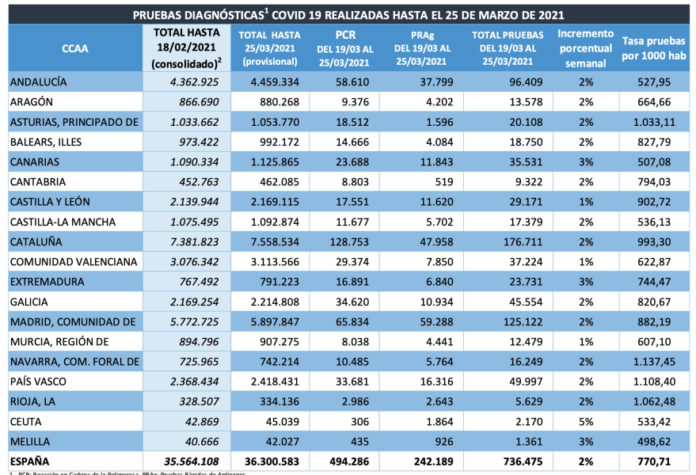 En la última semana, del 19 al 25 de marzo, las comunidades autónomas han realizado un total de 494.286 PCR, una media de 70.612 PCR al día.