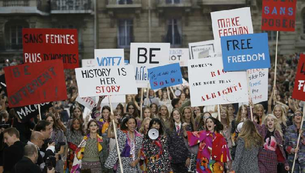 Karl Lagerfeld quiso dejar clara su opinión en el siempre esperado desfile de Chanel, el cual cerró el mes de septiembre en la Paris Fashion Week. En esta ocasión, el Grand Palais fue transformado en una calle parisina para presentar una colección muy ready-to-wear que finalizó con una manifestación feminista, en la cual pudimos ver a modelos como Cara Delevingne o Gisele Bundchen gritar a través de megáfonos “what do we want?” y pancartas en las que se leían frases como “Make Fashion Not War” o “Be Your Own Stylist”. Entre todas las modelos, pudimos ver a un modelo, Baptiste Giabiconi, que fue el elegido por el diseñador para llevar el cartel de He For She (haciendo referencia a la campaña y al discurso sobre igualdad de género que Emma Watson dio la semana anterior en la ONU).