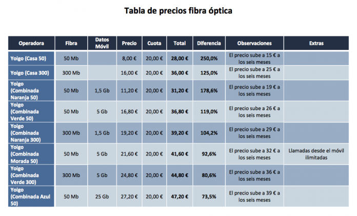 En muchos casos, solamente el importe de la cuota de línea es ya superior al de la fibra óptica ofertada. Ello importa incrementos en el precio de contratación sobre el precio anunciado de hasta el 250%, como es el caso de la fibra óptica que ofrece Yoigo con una tarifa teórica de 8 euros en su versión más económica. Si a esta cantidad se le suman los 20 euros de cuota de línea, el precio real se eleva hasta los 28 euros, cifra considerablemente superior a los 8 euros publicitados.