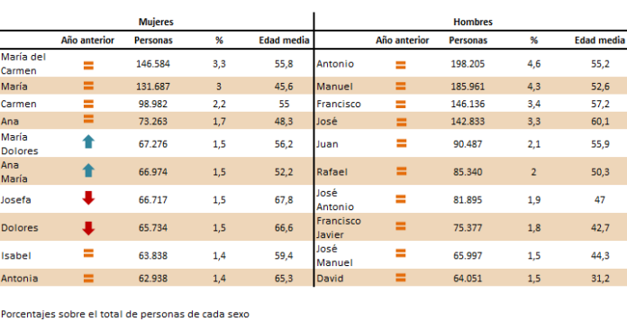 La lista de los diez nombres más frecuentes solo presenta cambios en las mujeres, donde María Dolores y Ana María escalan posiciones en detrimento de Josefa y Dolores. En cuanto a los valores, en general, se mantiene la tendencia de pérdida de población y envejecimiento de las personas que usan estos nombres. Solamente David parece ajeno a este comportamiento siendo el único nombre de este ranking que aumenta en población.