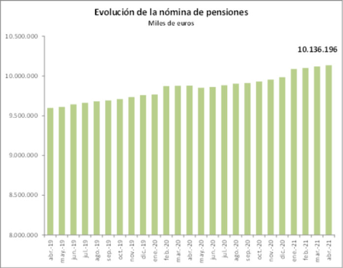 De las 9.825.545 pensiones contributivas abonadas a 1 de abril (un 0,34% más que en abril de 2020), 6.141.415 son de jubilación, 2.352.694 de viudedad, 947.296 de incapacidad permanente, 340.912 de orfandad y 43.228 en favor de familiares.