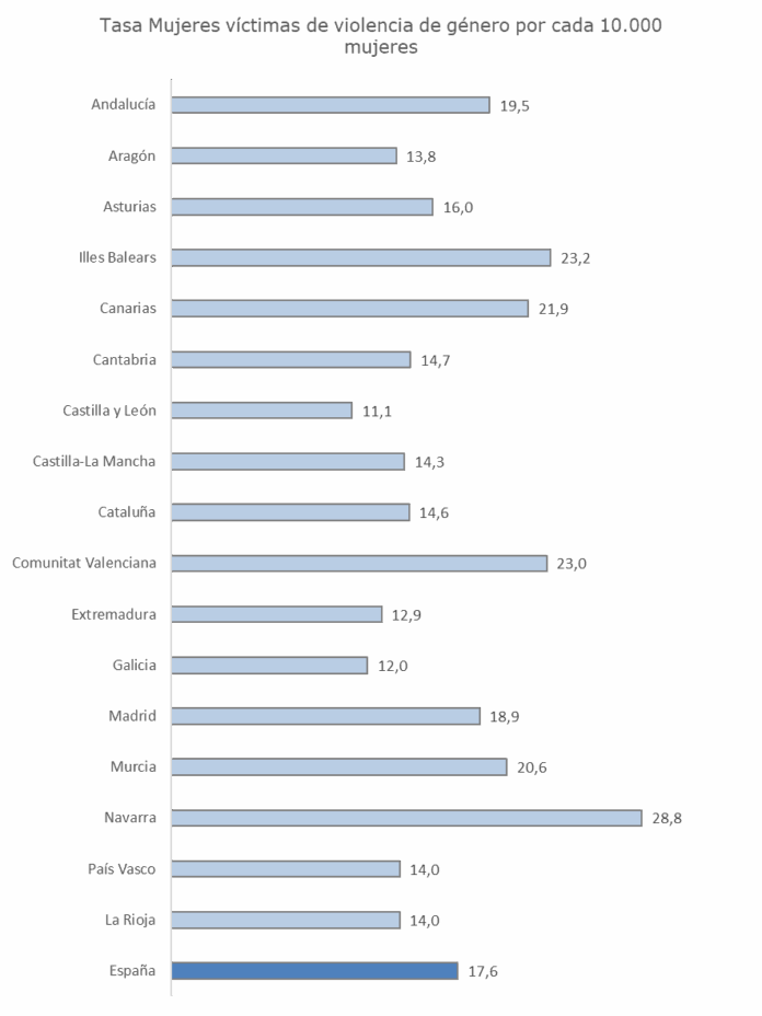 La tasa nacional de víctimas denunciantes fue de 17,6 por cada 10.000 mujeres. Por encima de la media se situaron Navarra con 28,8, Baleares con 23,2, Comunidad Valenciana con 23, Canarias con 21,9, Murcia con 20,6, Andalucía con 19,5 y Madrid con 18,9.