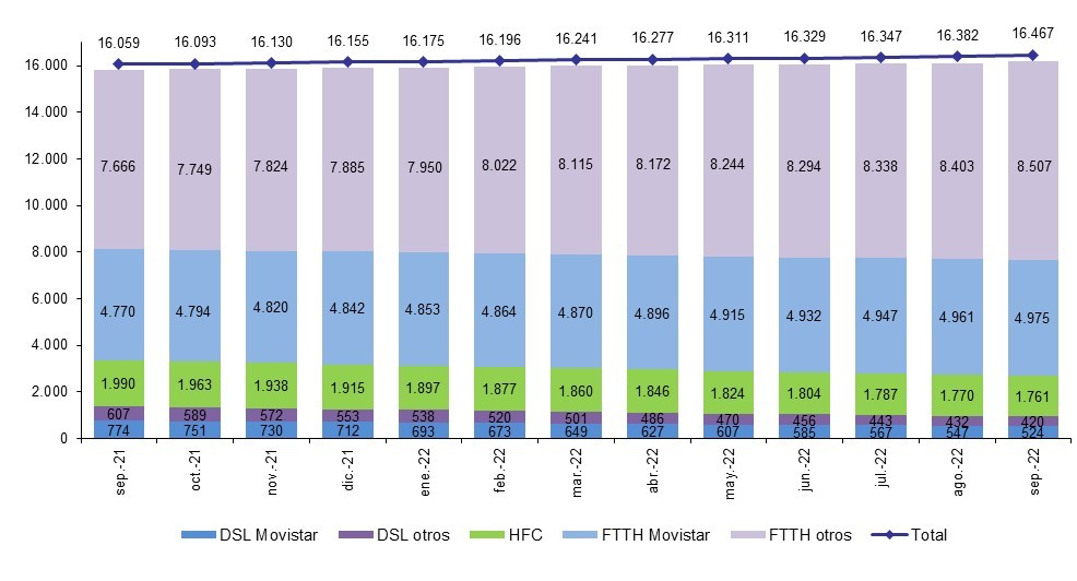 A nivel anual, respecto a septiembre de 2021, destaca el aumento de 1 millón de líneas FTTH, frente a la pérdida de 0,4 millones de líneas con tecnología DSL.
