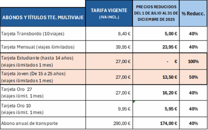 El Consistorio también prorroga durante el segundo semestre de 2025 la reducción de entre el 50% y el 40% en los precios del transporte urbano para todos los abonos y tarjetas. La tarjeta transbordo de diez viajes se mantiene en 0,50 euros por viaje, mientras que las tarjetas de estudiantes y jóvenes conservan su precio de 13,50 euros mensuales.