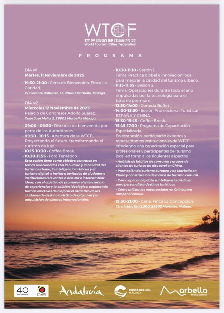 El Ayuntamiento de Marbella, Turismo y Planificación Costa del Sol, la Consejería de Turismo y Andalucía Exterior de la Junta de Andalucía y la Federación Mundial de Ciudades Turísticas organizan el Foro WTCF Marbella 2025 los días 11 y 12 de noviembre en Marbella. El encuentro internacional reunirá a autoridades, expertos y representantes del sector turístico bajo el lema Reorganizando el Turismo de Alto Nivel.
