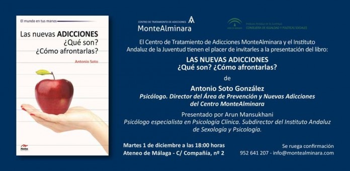 El psicólogo y director del Área de Prevención y Nuevas Adicciones del Centro MonteAlminara, Antonio Soto, presentará el próximo martes 1 de diciembre, a las 18.00 horas, en el Ateneo de Málaga, el libro titulado “Las nuevas adicciones”, en el que analiza las nuevas formas de adicción que han irrumpido en la sociedad actual, como la adicción a dispositivos móviles, a videojuegos, internet, al juego o al sexo, y las formas que existen de reconocerlas y afrontarlas.