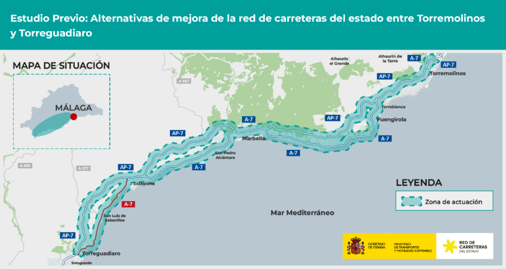 - Ampliación de capacidad y/o mejora de la autovía A-7, incluyendo la reordenación de accesos mediante la ejecución de vías colectoras, laterales o vías de servicio, la remodelación de enlaces, etc. El objetivo fundamental debe ser el de mejorar la seguridad vial del ámbito, y en la medida de los posible, reducir la congestión.