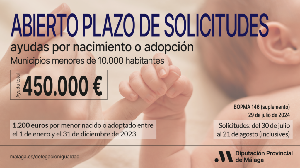 La Diputación de Málaga ha abierto el plazo de presentación de solicitudes para la convocatoria de ayudas por nacimiento o adopción, que concluirá el 21 de agosto. La iniciativa está dotada con 450.000 euros y establece una cuantía de 1.200 euros por menor, lo que podría beneficiar a unas 375 familias de municipios menores de 10.000 habitantes.
